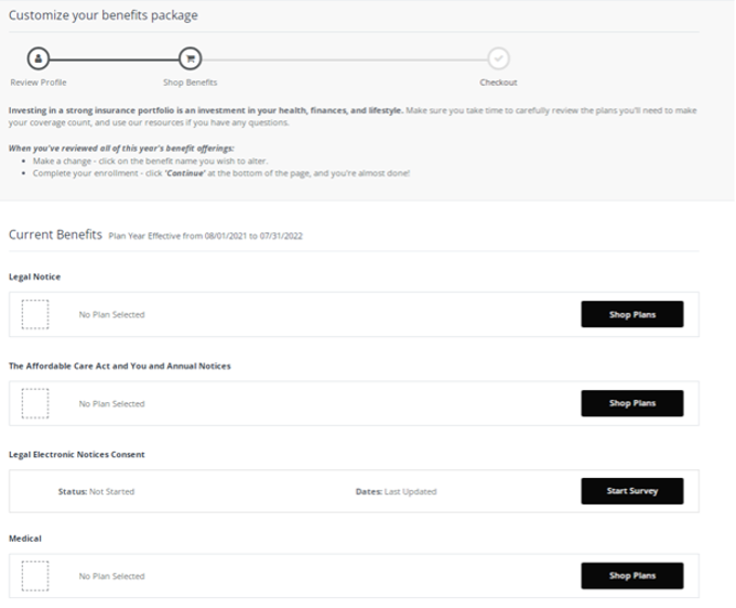 You can always review your elections by viewing the Shopping Cart. The shopping cart displays a running total of your combined benefits costs and shows your progress. You will need to select or decline a plan in each benefit type before you can check out.